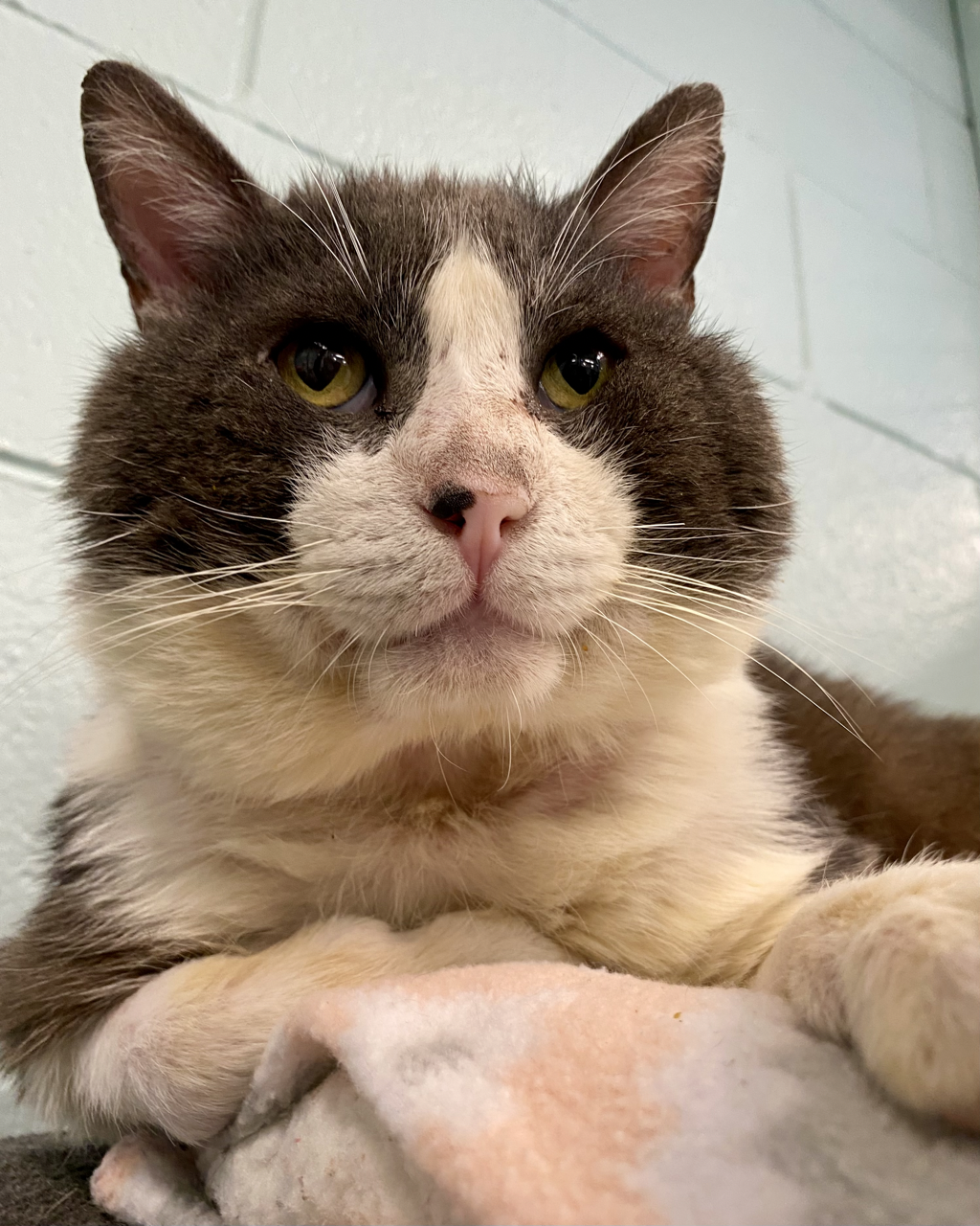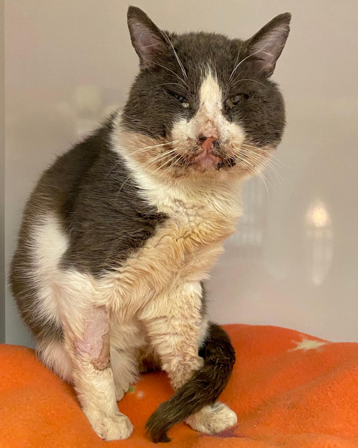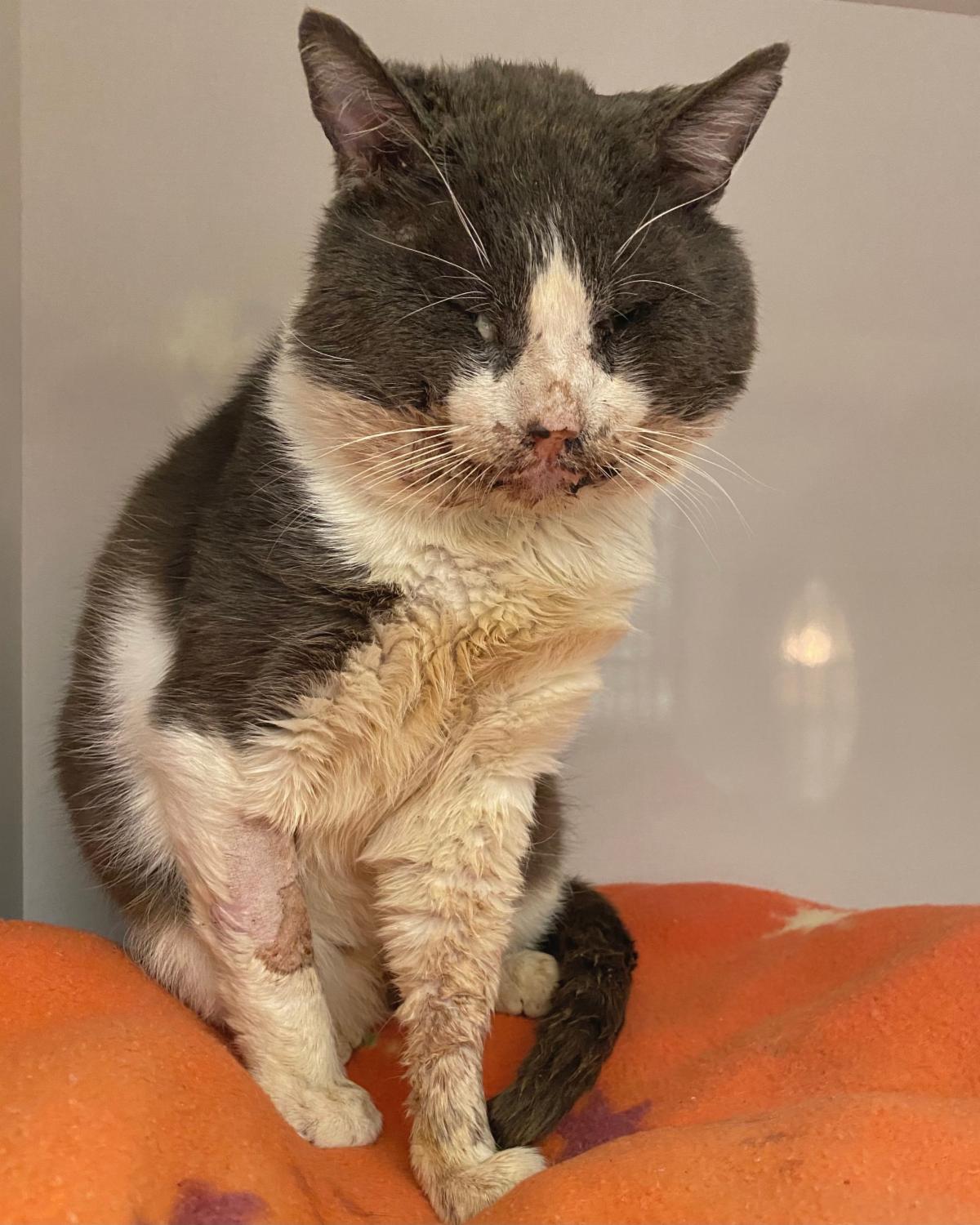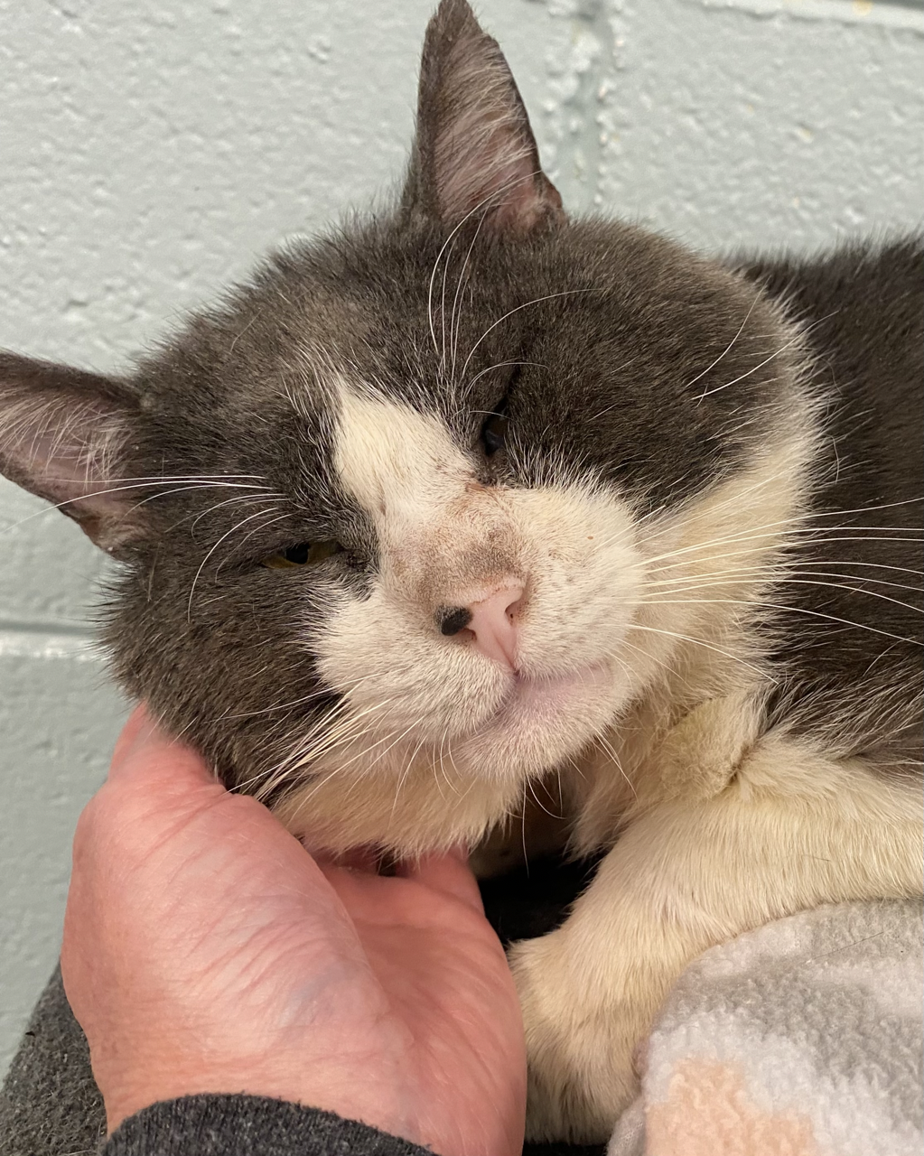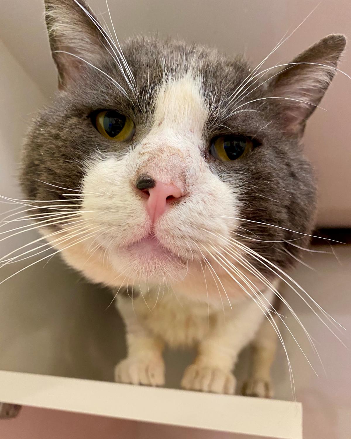During a spay/neuter clinic in early March, Dr. Desai noticed a large gray and white kitty in a feral trap, waiting his turn for surgery. This kitty, named Winston, was in extremely poor health — congested, drooling excessively, and covered in fleas, with multiple wounds on his body. Despite his condition, Winston was nudging his body against the cage, asking for attention. Dr. Desai began petting him and remarkably he began to purr.